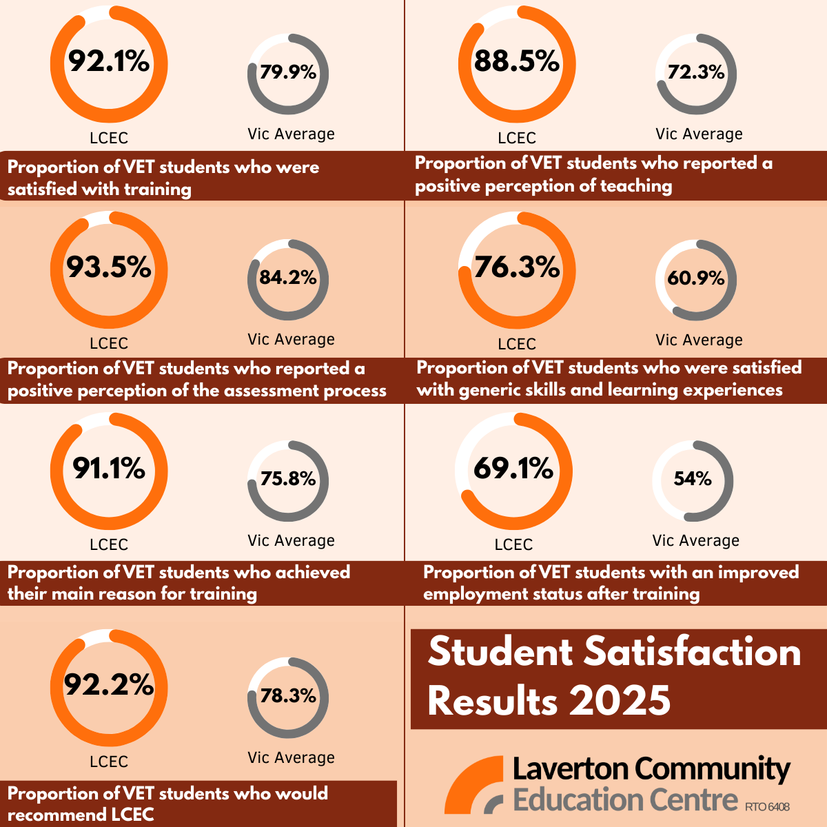 Every year the Victorian Skills Authority surveys students in the VET sector for satisfaction with their provider and the training it provided. In 2024 67,500 students across 264 RTO’s were surveyed. LCEC achieved outstanding results again. Many thanks to our students for their support!
